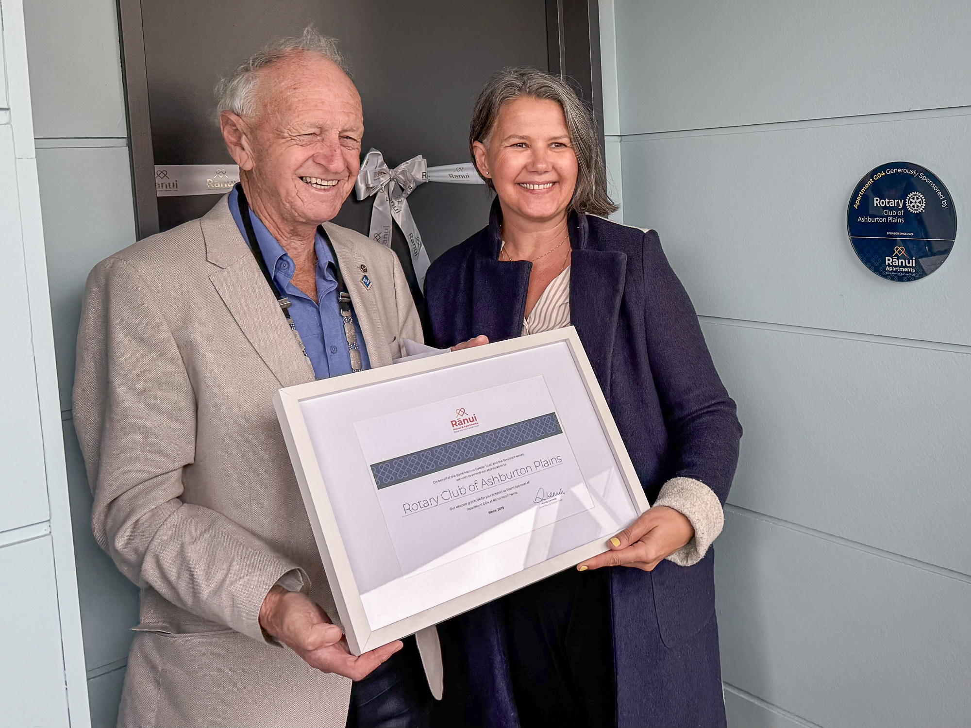 Today, members of the Rotary Club of Ashburton Plains had the privilege of visiting Rānui Apartments in Christchurch for a very special celebration—the sponsorship of an apartment.